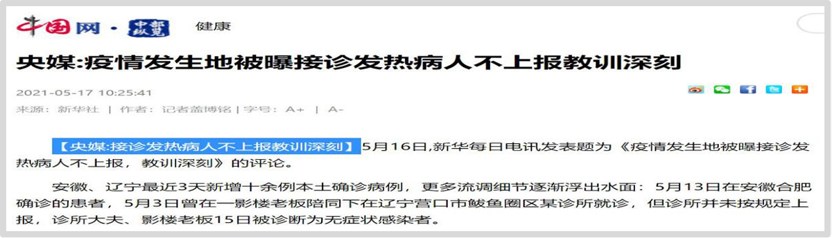 20215月初開始,安徽、遼寧近3天新增十余例本土確診病例,更多流調細節逐漸浮出水面:513日在安徽合肥確診的患者,53日曾在一影樓老板陪同下在遼寧營口市鲅魚圈區某診所就診,但診所并未按規定上報,診所大夫、影樓老板15日被診斷為無癥狀感染者。